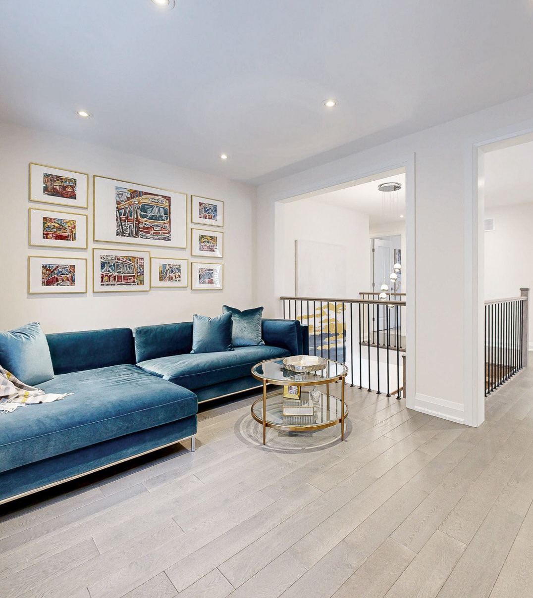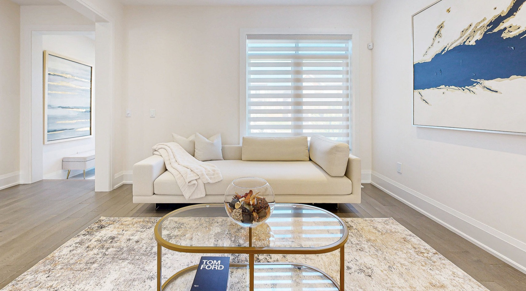 The living room’s elegant symmetry and soft natural light create a space equally suited for lively gatherings or quiet evenings. A modern fireplace with custom mantle anchors the room, while a nearby powder room—finished in the same refined palette—adds both function and polish to the main floor.