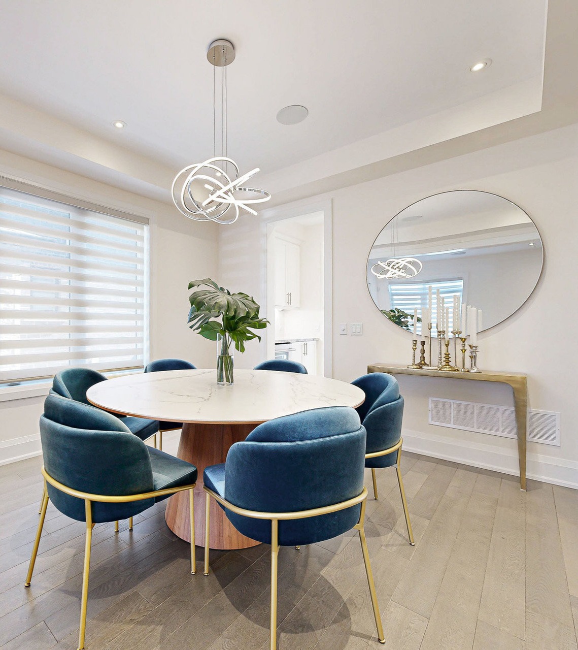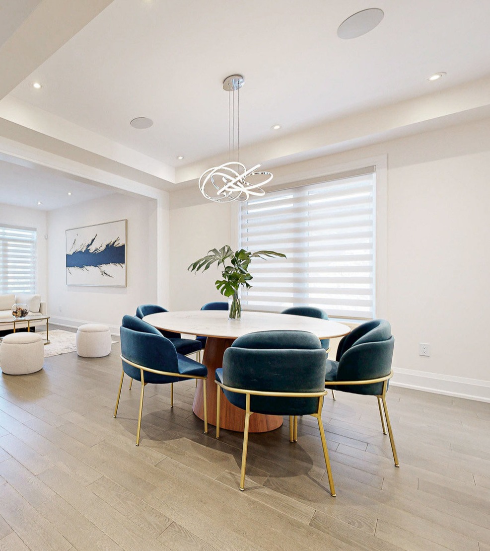 Flooded with light and framed by sleek Louvolite blinds, the breakfast area and dining room feel simultaneously intimate and open. Custom lighting, expansive floors, and curated finishes elevate every meal into a moment—whether it's a weekday breakfast or celebratory dinner.