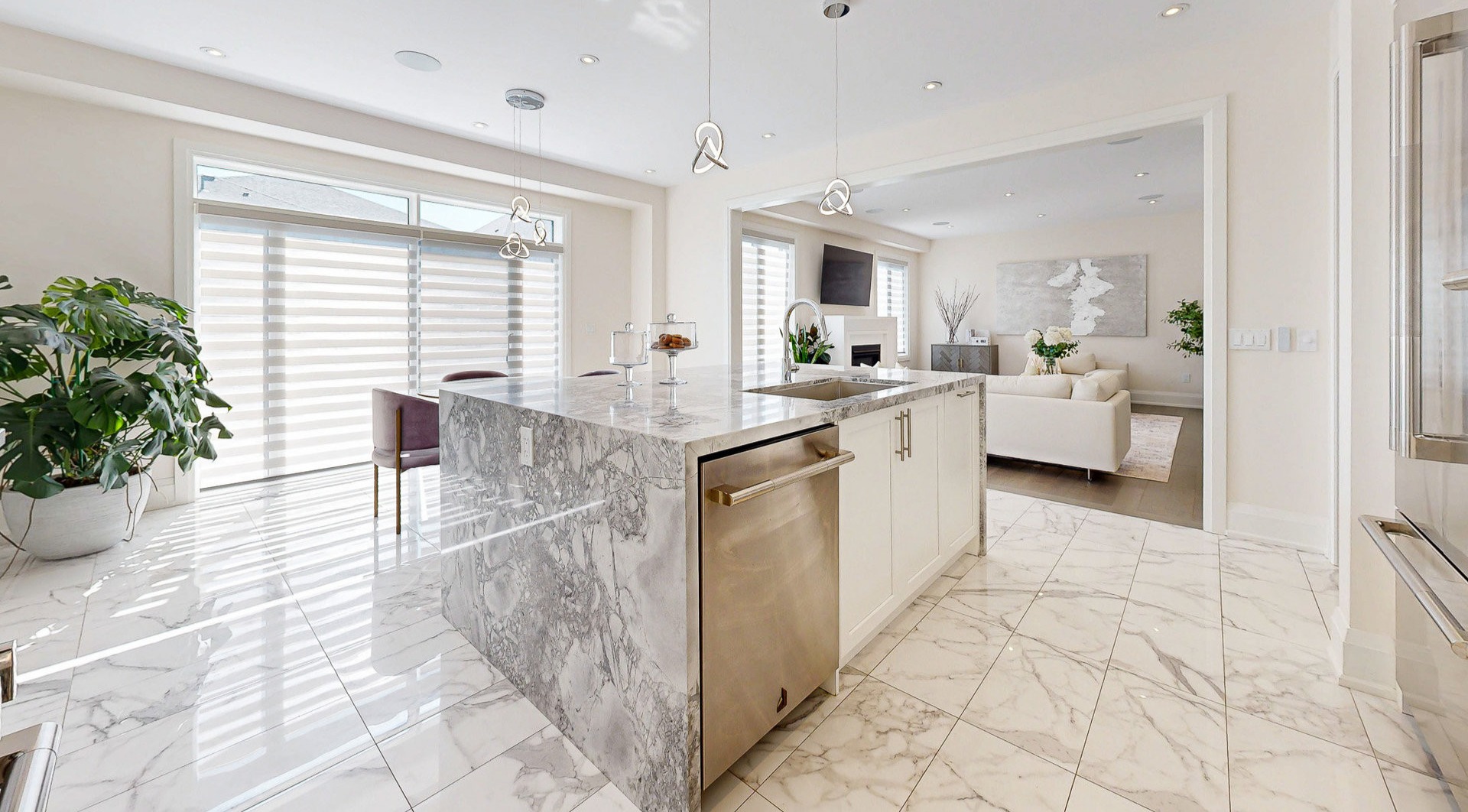 A chef's kitchen that stuns without shouting—centered around a dramatic marble waterfall island. Equipped with a full suite of high-end Jennair appliances, a built-in espresso machine, pot filler, and wine fridge, this kitchen blends indulgence and precision into one seamless experience.